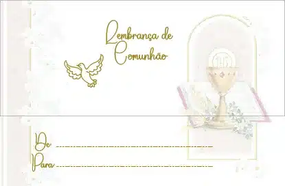 Com envelope prenda impresso com o texto Lembrança de Comunhão’ e desenho relacionado.